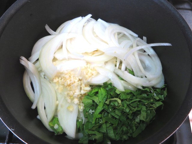 ↑玉ねぎ・セロリ・にんにくをオリーブオイルで炒める。