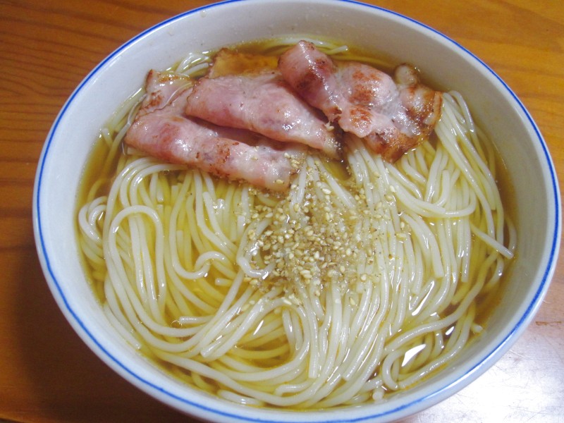 相変わらず、キムチも野菜も無いので、焼いたベーコンのみ。