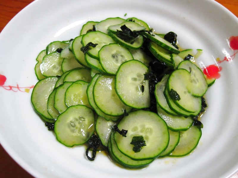 ↑キュウリとワカメの柚子ポンサラダ。夫の人に好評。