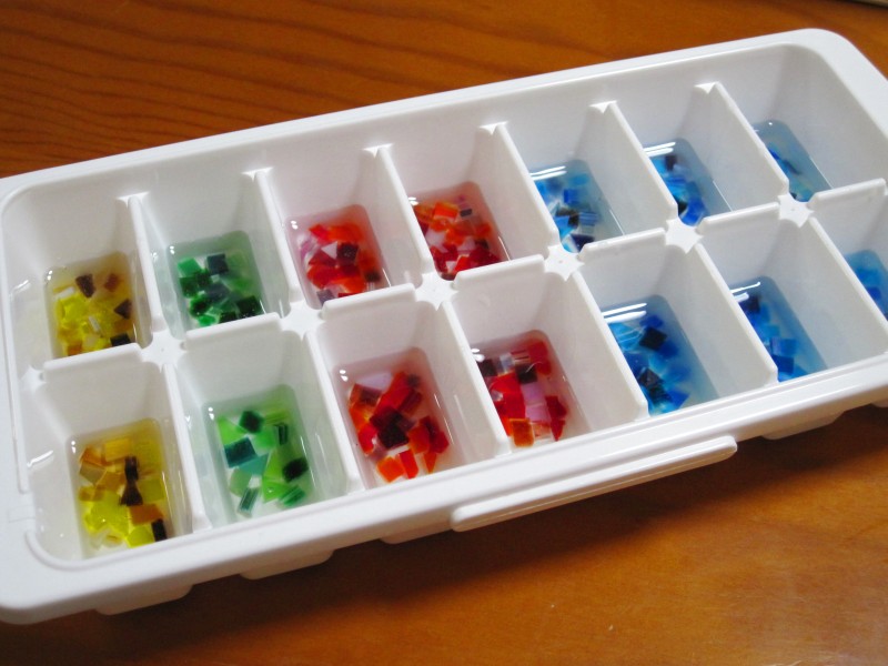 製氷皿にガラスのかけらを入れて、混ぜたレジン液を流し込んだ。