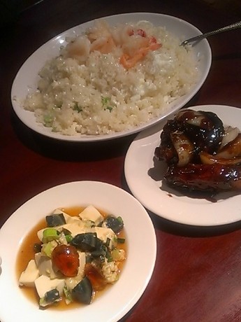 ↑夜ご飯。手前から、ピータン豆腐・酢豚・エビと卵白の炒飯。