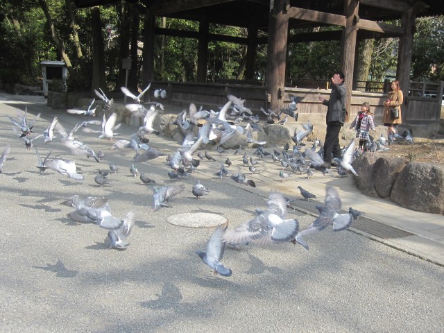 ↑エサをまいて、ハトに群がられるおじさんがいた。