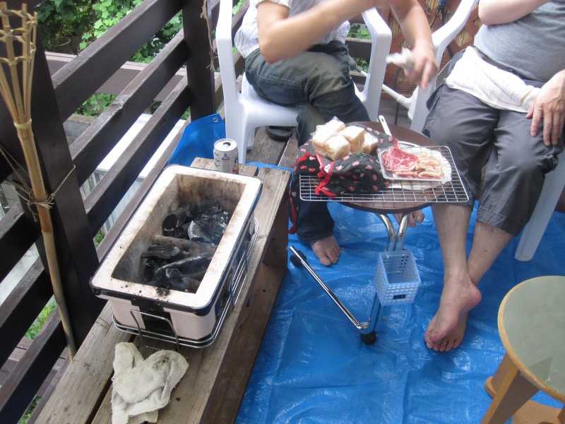 ↑七輪で日本酒の会@週末独身貴族みなそこさん宅ベランダにて。