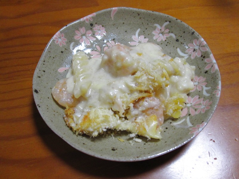 ↑夜ご飯。夫の人の特製・マカロニグラタン。えび入り。