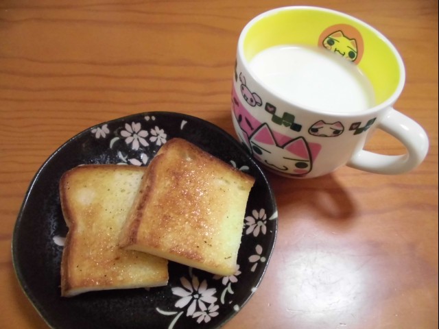 ↑朝ご飯。シュガートースト・ホットミルク。