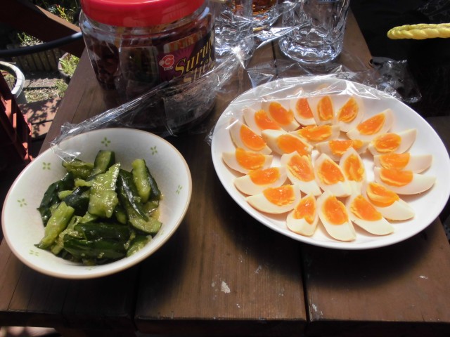 ↑たたきキュウリ・ゆで玉子味噌漬け。肉待ちの間のおつまみに。