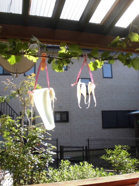 竹串を刺して、ビニールひもで吊るして、天日干し。