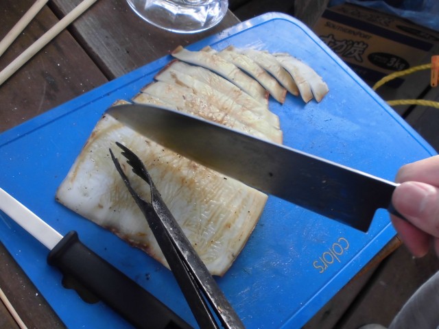 ↑炭火で焼いて、みんなで一口ずつ。しゃくしゃく、甘い。