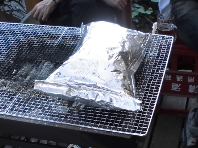 銀紙ホイルのバッグに、食材を入れて、口を閉じて焼く。