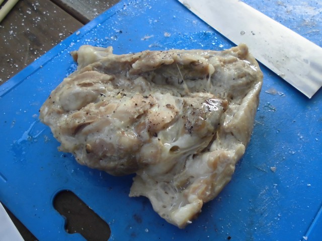 ↑取り出した肉は、おいしい蒸し鶏だった。