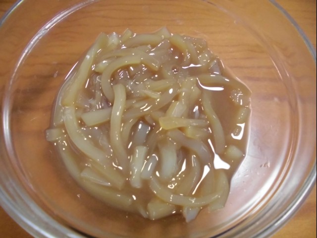 皮をむいたイカを細切りにして。