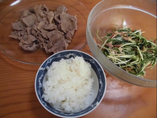 ↑昼ご飯。牛肉を焼いたやつ・ご飯・水菜サラダ続き。