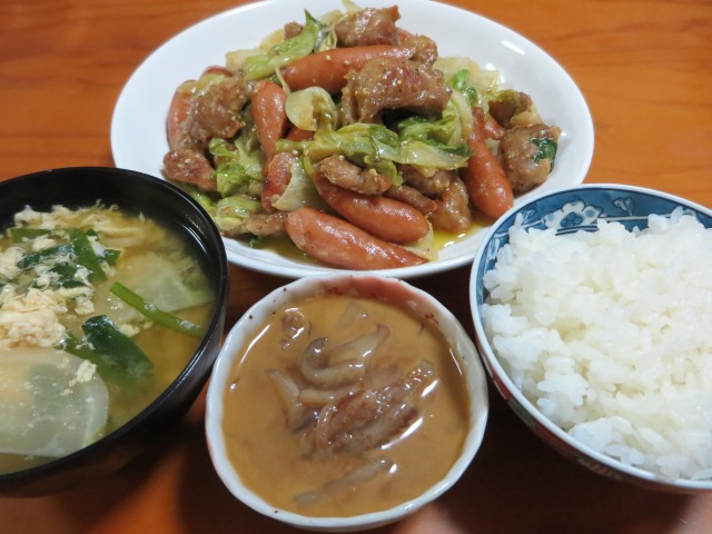 ↑夜ご飯。炒め物・味噌汁・イカ漬け・ご飯。