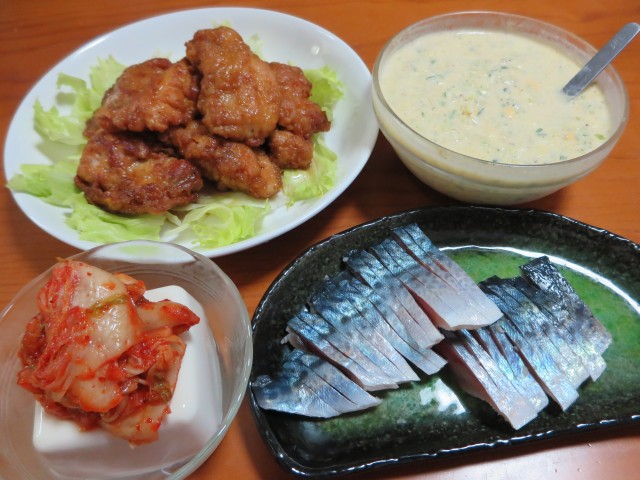 ↑夜ご飯。チキン南蛮・タルタルソース・キムチ奴・しめ鯖。