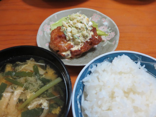 ↑タルタルたっぷりかけたチキン・味噌汁・ご飯。