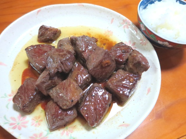 ↑夜ご飯。一口ビーフステーキ・ご飯。