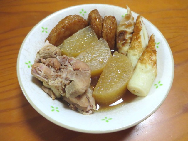 ↑夜ご飯。鶏肉・さつま揚げ・ちくわ・大根の煮物。