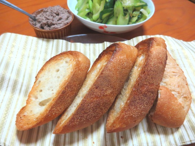 ↑夜ご飯。パン・レバーペースト・キュウリ&セロリ浅漬け。