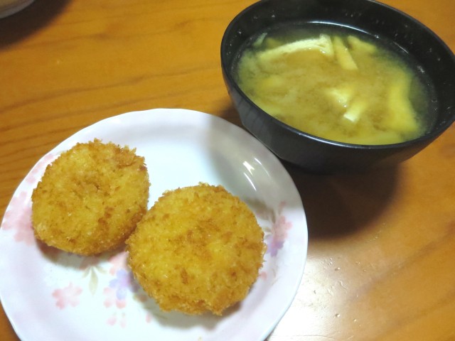 ↑ひとくちコロッケと、パン食でも味噌汁。