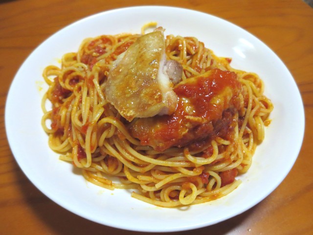 ↑夜ご飯。夫の人特製・トマトパスタ。鶏肉添え。