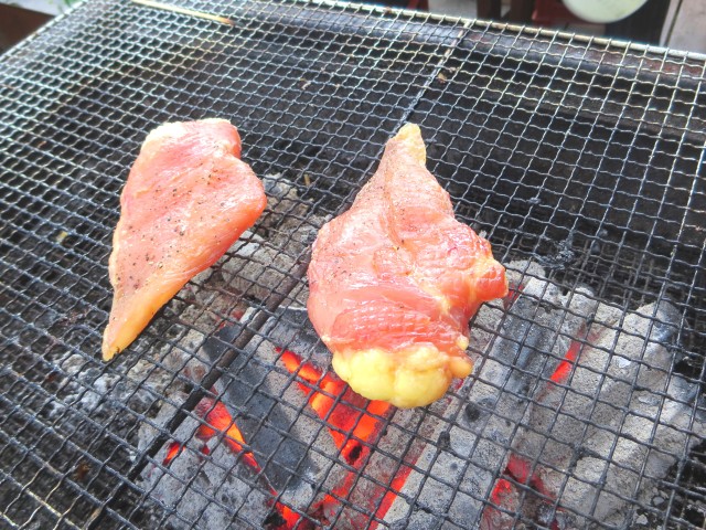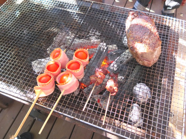 網の下、炭の横には、ホイルで包んだジャガイモ。