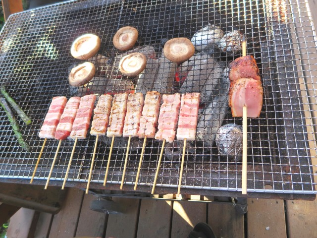 ↑豚串・しいたけ。画面左端、焼いたアスパラうまうま。