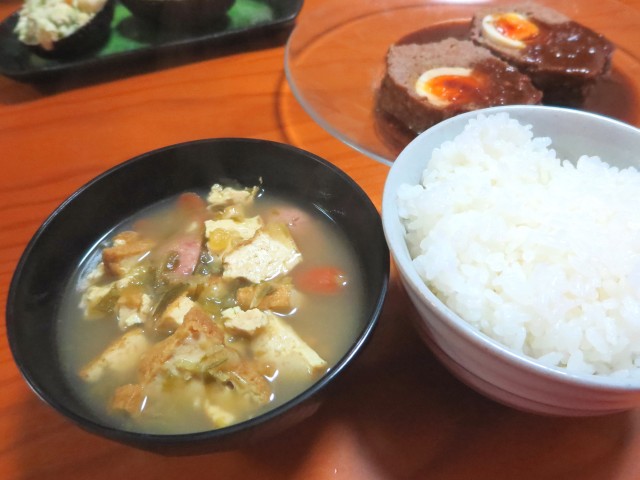 ↑厚揚げとウインナーのスープ・ご飯。