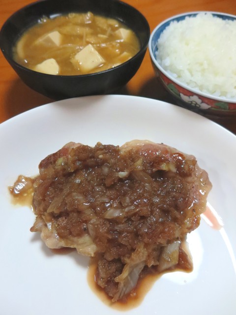 ↑味噌汁・ご飯・ポークソテー、玉ねぎソースで。