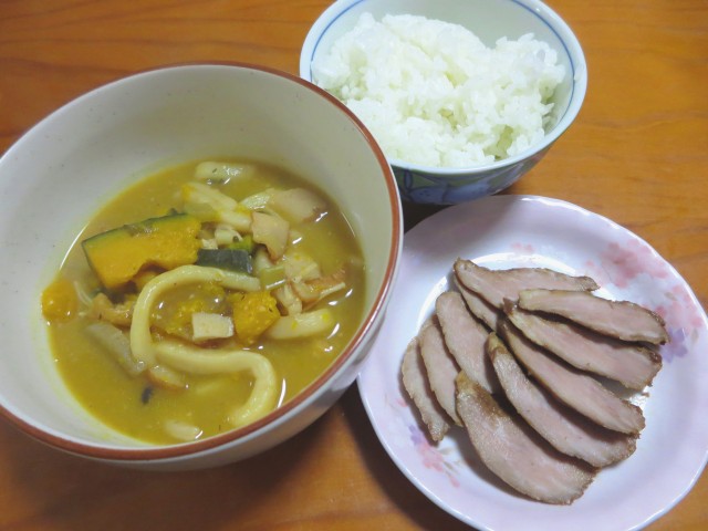 ↑ほうとうっぽいもの・ご飯・煮豚。
