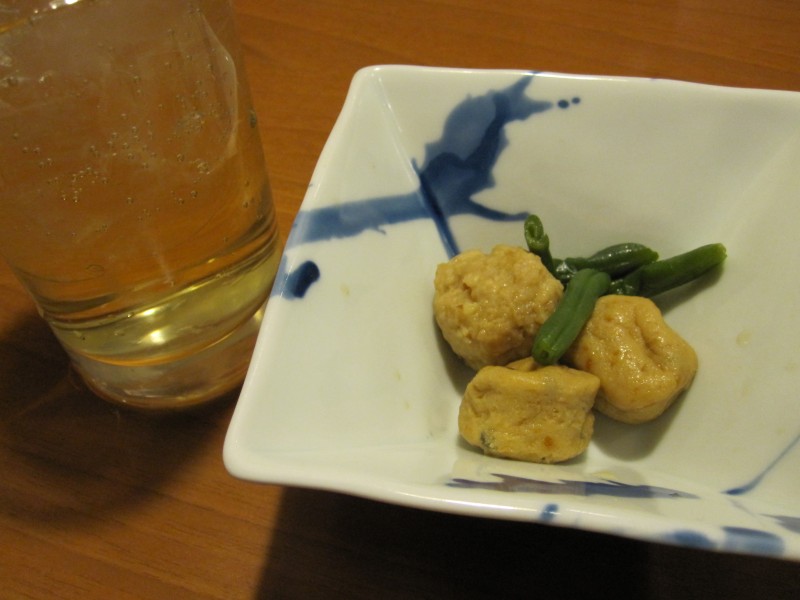 ↑梅酒ソーダ割り・お通し。肉団子と、ミニがんも?の煮物。いいお味。
