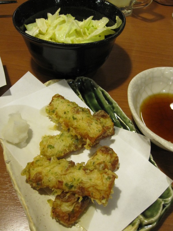 ↑あまりにうまくておかわりした塩だれキャベツ。ちくわ磯辺揚げ。