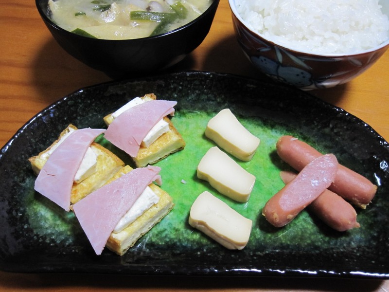ハムチーズ厚揚げつまみ・味噌漬け豆腐・味噌漬けウインナー。