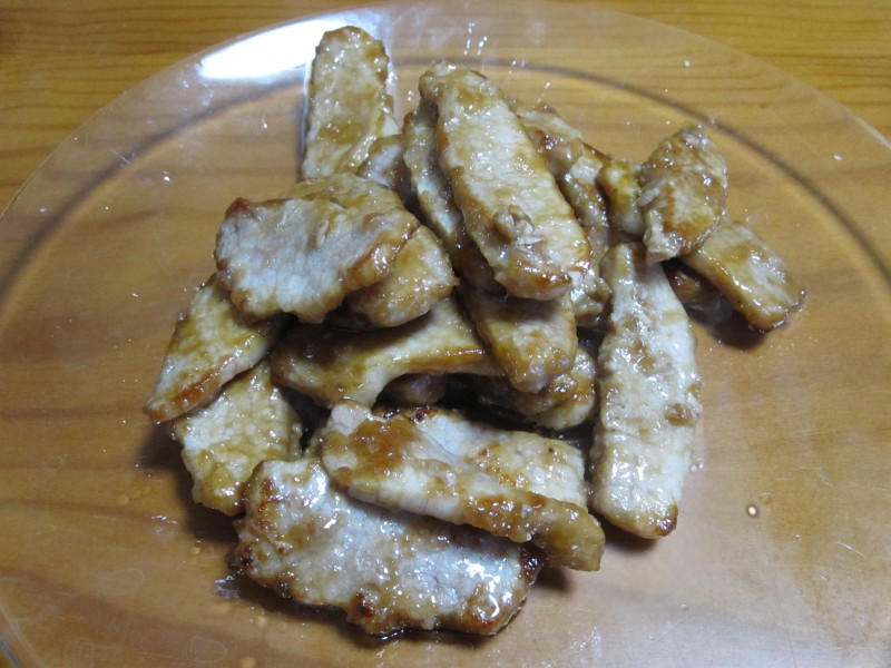 ↑豚肉の生姜焼き。一口サイズ。夫の人が焼いてくれたー。