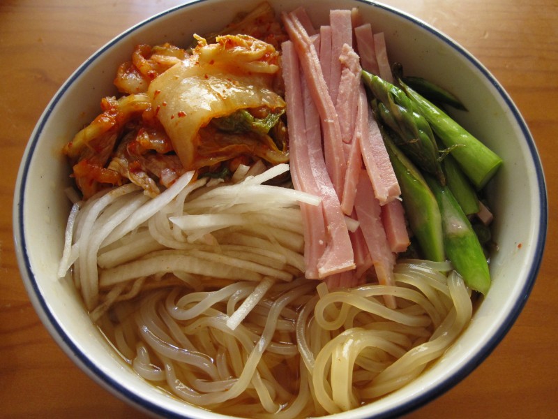 トッピングは、キムチ・大根千切り・ハム・炒めたアスパラ。