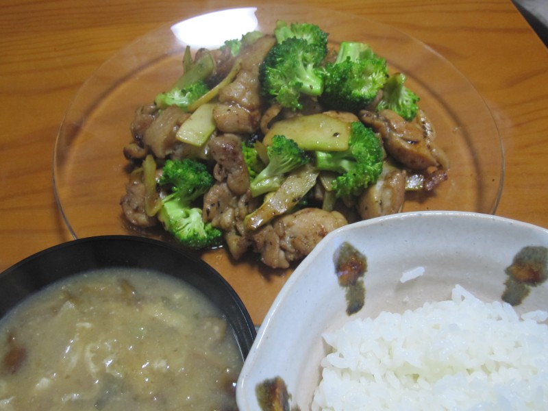 ↑夜ご飯。なめこ味噌汁・ご飯・ブロッコリーと鶏肉の炒め物。