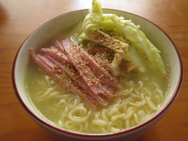 ↑昼ご飯。塩ラーメン。 トッピングは、ハム・塩だれキャベツ・ゴマ。うまうま。