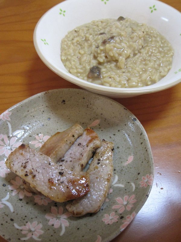 ↑昼ご飯。ポルチーニ茸のリゾット・豚肉を焼いたの。