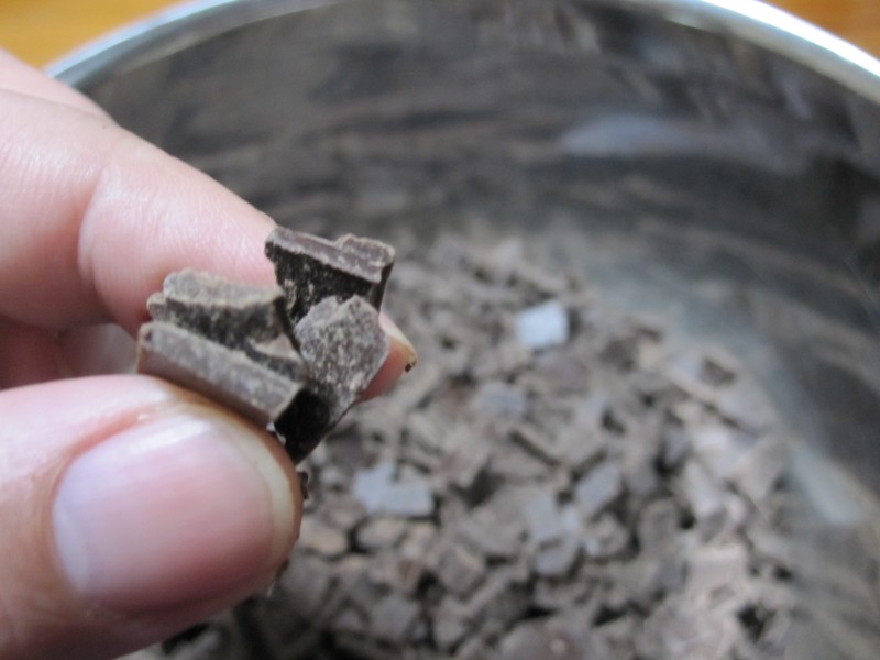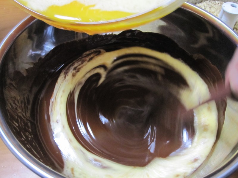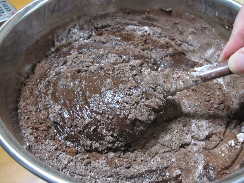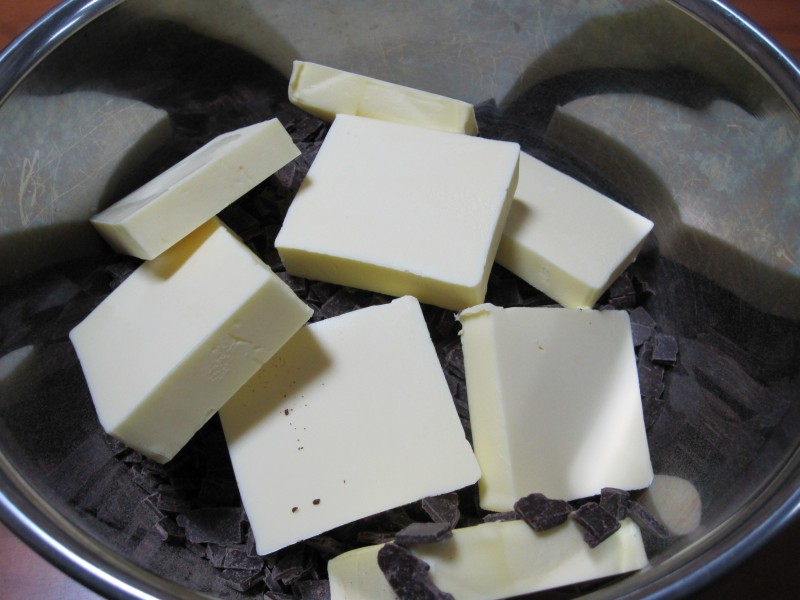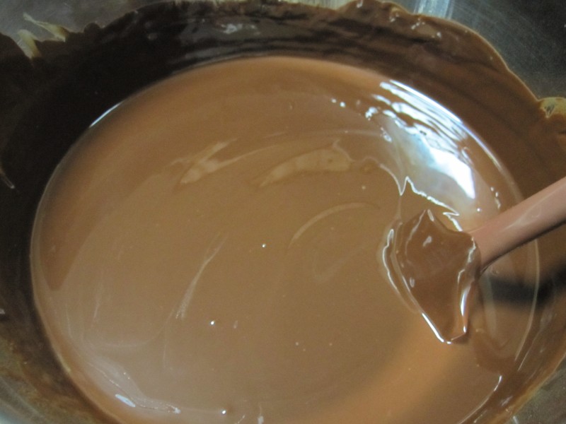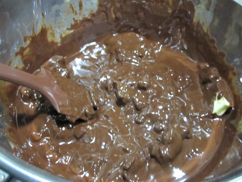 ↑チョコとバターのボウルを湯煎にかけてとかす。どろどろ。