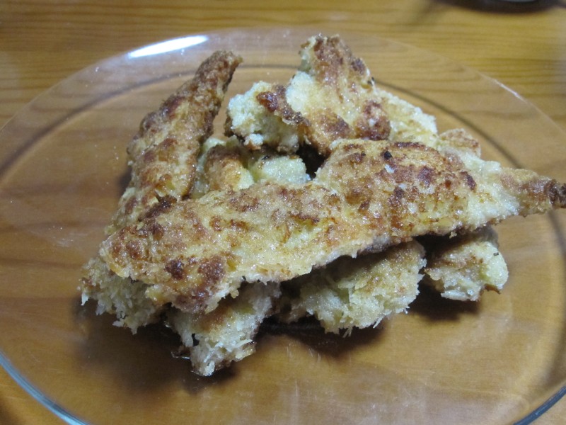 これはササミじゃなくて、鶏もも肉を薄くそぎ切りにして揚げ焼き。