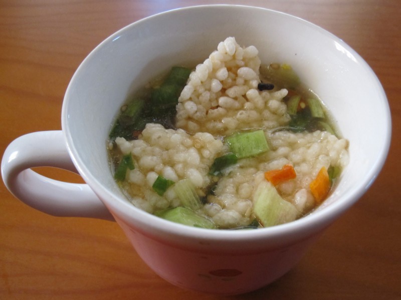 ↑朝ご飯。五穀おこげのスープ。今日は中華しょうゆ味。