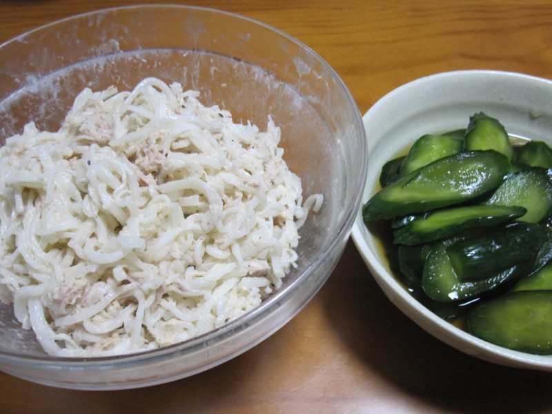↑大根ツナマヨサラダ・昨日のキュウリ浅漬けの残り。