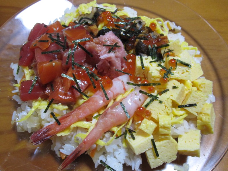 ↑夫の人が刺身を買って帰ってきたので、ちらしが豪華に!