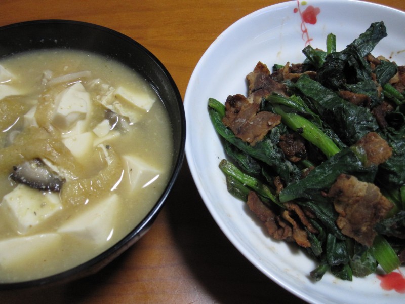 ↑味噌汁・豚肉とほうれん草の炒め物(ちょい焦げ