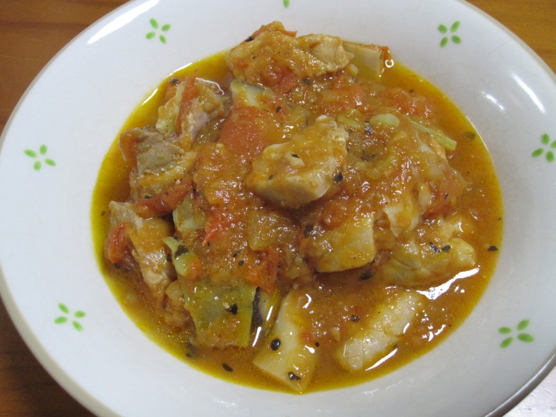↑鶏肉のトマト煮。エリンギと、ブロッコリーの茎も入れてみた。