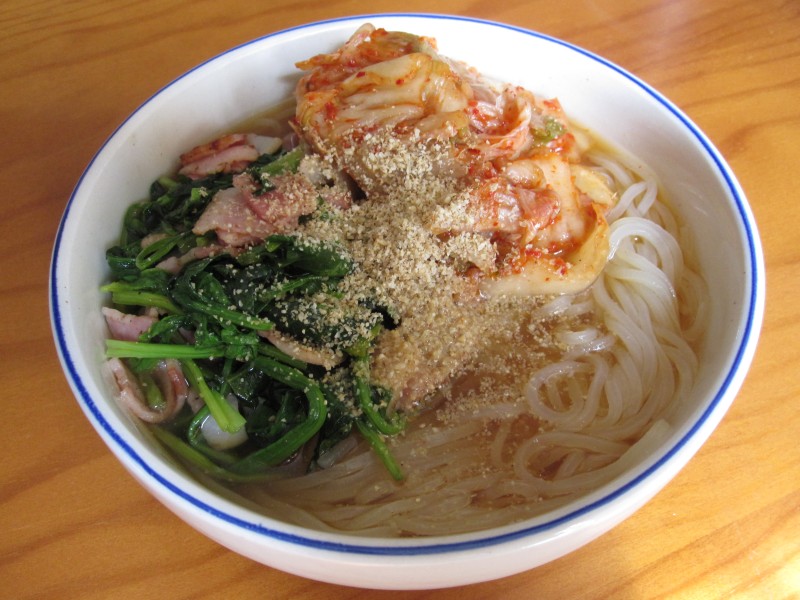 ほうれん草&ベーコン炒め・キムチ・すりゴマをトッピング。うまー。