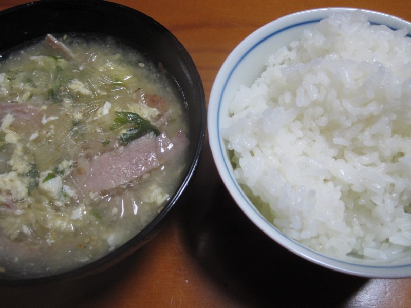 ↑夜ご飯。春雨スープ・ご飯。