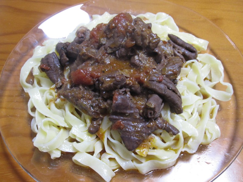 ↑夜ご飯は、モツのトマト煮のフェットチーネ。