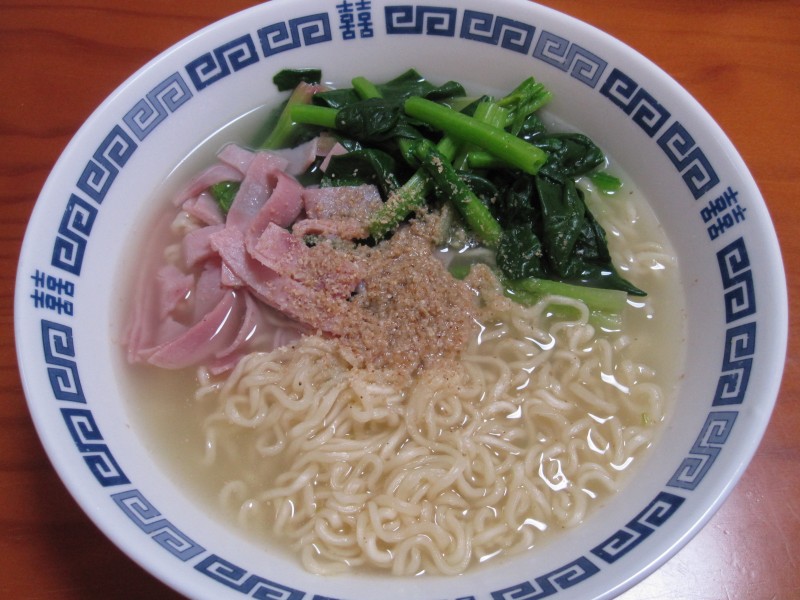 トッピングは、ほうれん草・ハム・ゴマたっぷり。
