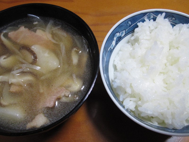 ↑夜ご飯。野菜とハムのスープ・ご飯。