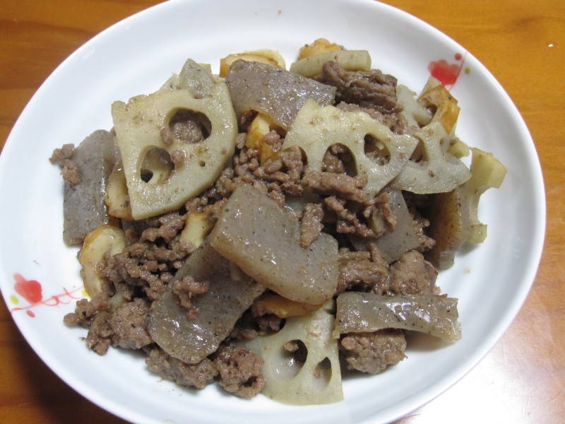 ↑ひき肉・蓮根・こんにゃくの炒め煮。
